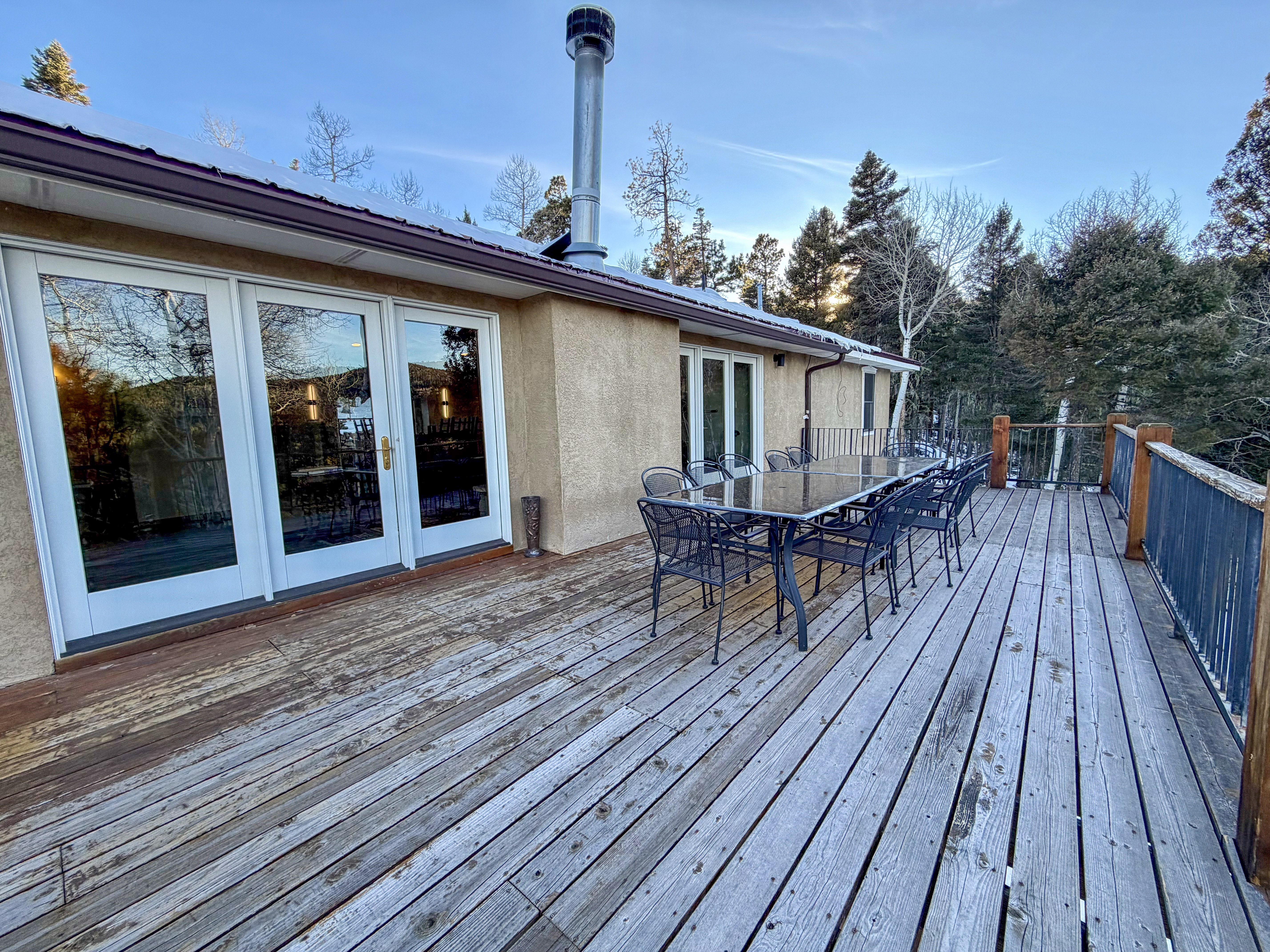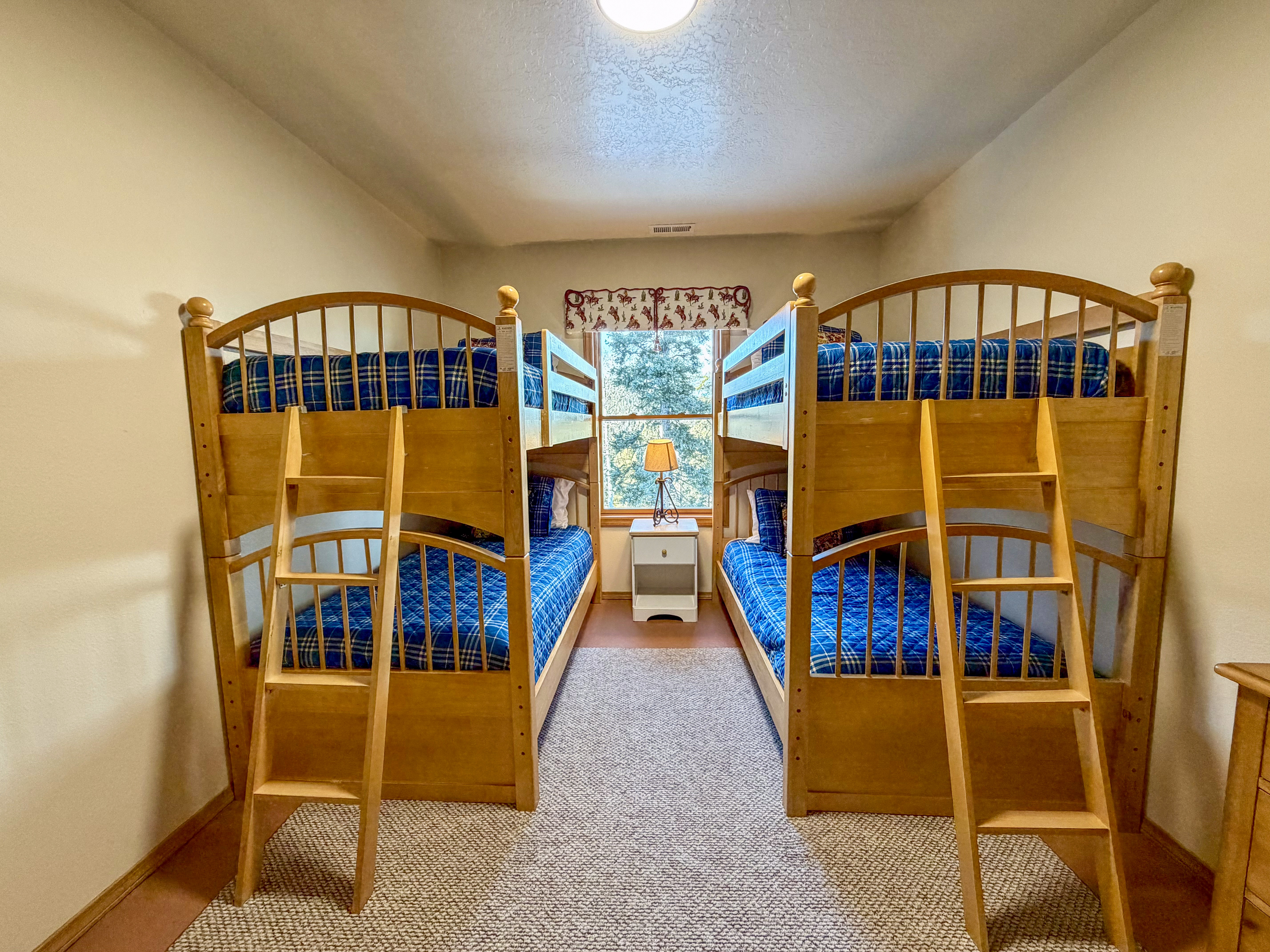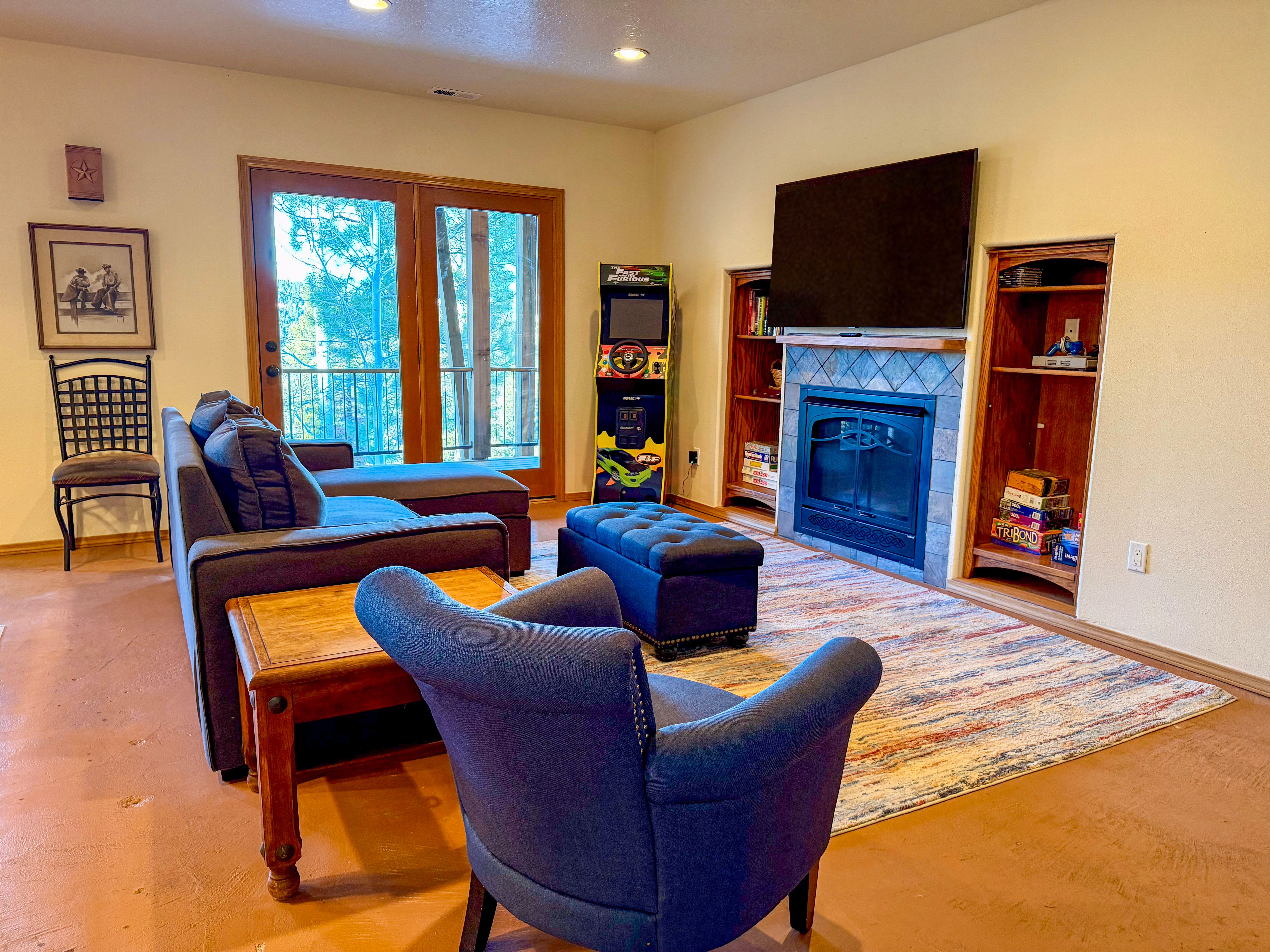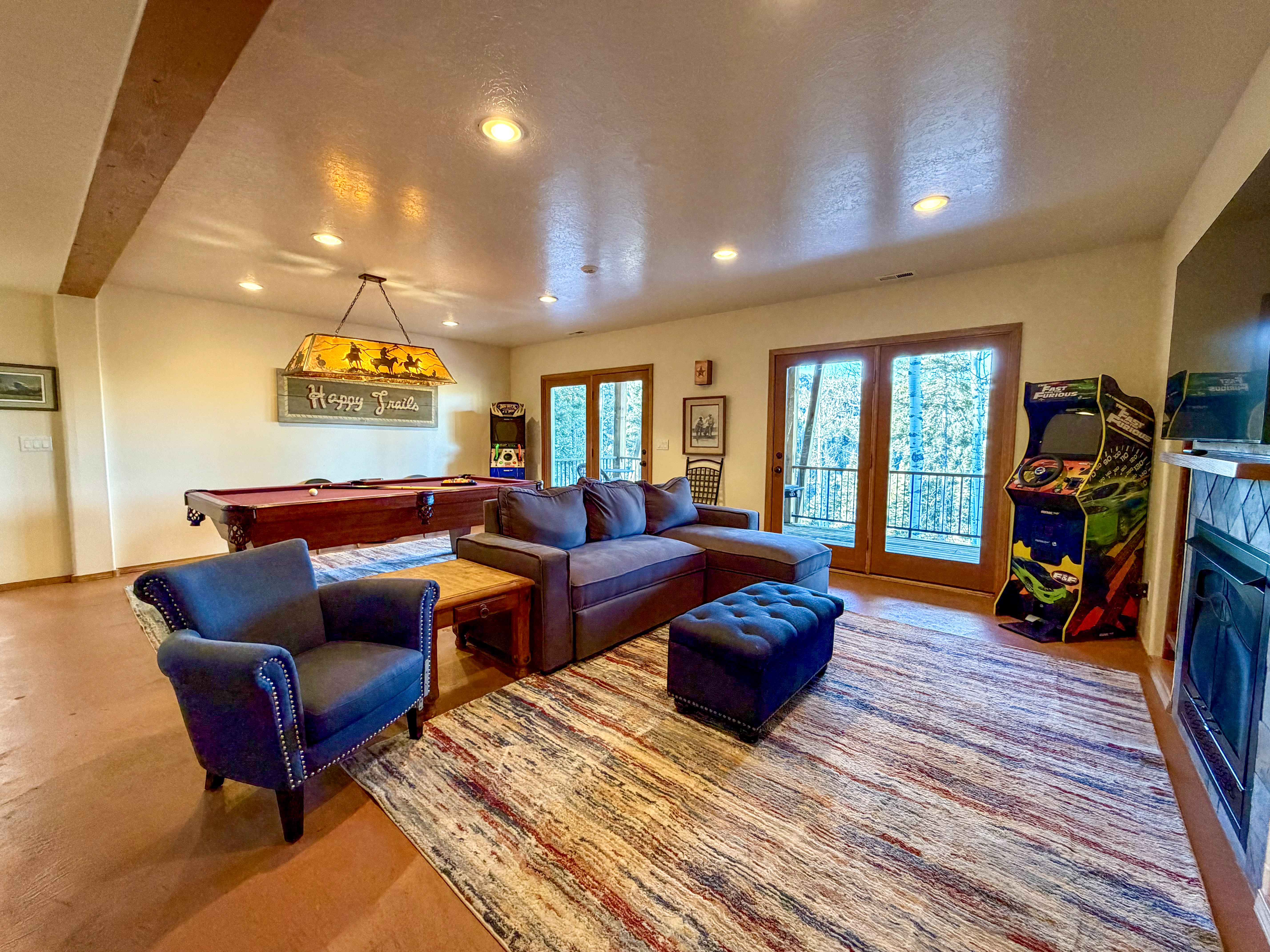 With 3,473 square feet of thoughtfully designed living space, Sierra Blanca Lodge is more than just a place to sleep—it’s your private mountain sanctuary. The two-story layout is specifically engineered for large groups, allowing for high-energy fun downstairs while maintaining a peaceful retreat upstairs. ✨ Upstairs: The Social Heart (Main Level) The top floor is bathed in natural light, featuring vaulted ceilings and floor-to-ceiling views of the alpine landscape. The Great Room: Gather around the cozy wood-burning fireplace for morning coffee or evening cocktails. The open-concept design ensures nobody is left out of the conversation. Chef’s Kitchen: Newly remodeled and fully equipped, this kitchen features modern appliances and generous counter space—perfect for prepping big family taco nights or holiday feasts. The Upper Deck: Step out from the living area onto the massive deck. It’s the ultimate spot for alfresco dining, grilling, or simply breathing in the crisp mountain air. Primary Suite: A secluded king-bed retreat with a private, newly remodeled ensuite bathroom. Queen Guest Rooms: Two additional queen bedrooms sit on the opposite side of the home, providing a quiet buffer for guests. They share a convenient, full-sized bathroom. 🎮 Downstairs: The Ultimate Hangout (Lower Level) This level is all about entertainment and maximizing sleep capacity without feeling crowded. The Game Room: This is where the memories are made. Challenge your group to a tournament on the full-sized pool table or go for a high score on the retro arcade games. It doubles as a second family room with plenty of space to lounge. The Bunk Rooms: Perfect for the kids or the young-at-heart, two bedrooms each feature two sets of bunks (8 beds total!). This level stays naturally cool and quiet. Full Bathrooms: Two additional full bathrooms serve this level, ensuring there is never a line for the shower in the morning. The Lower Deck: A second expansive outdoor space for even more room to spread out and enjoy the forest surroundings. 🏠 Extras for a Seamless Stay Laundry Room: Full-sized washer and dryer available for your convenience—perfect for drying out ski gear or freshening up hiking clothes. Privacy-First Layout: The "split" design means the primary suite and main living areas remain a sanctuary of peace while the game room excitement stays downstairs.